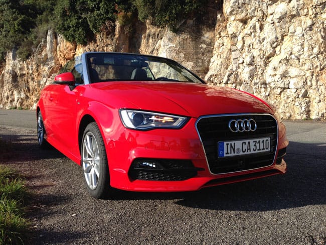 Doch nicht etwa irgendein Cabrio, sondern das Audi A3 Cabrio stand zum Kurztest bereit. Das kommt zwar erst im Frühjahr 2014 auf den Markt, doch Audi stellte uns den Wagen mit Stoffverdeck gern schon mal vor. Wobei es das Verdeck in 2 Ausführungen gibt. Einmal die Ausführung „leichtes Stoffverdeck“ und ein Akustikverdeck. Das letztere hat eine dickere Materialdichte und senkt das Geräuschniveau im Wageninneren, wenn man denn mal mit hochgezogener Kapuze fahren muss. Einen Vergleich konnte ich leider nicht durchführen, denn beide Cabrios, die ich fuhr, hatten diese hochwertige Ausführung.