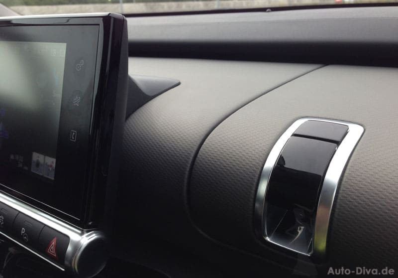 Besonders seitlich fallen die plastischen Plastik-Applikationen auf. Gewöhnungsbedürftig – entweder man liebt es oder hasst es. Doch es ist kein Airbag dahinter, wie man erst vermuten könnte, sondern die verletzliche Seite wird einfach besser vor den Türaufreißern des Nachbarfahrzeugs geschützt. Gerade neulich ist mir das wieder passiert, dass ich beinahe selber meine Tür angestoßen hätte, als ich die Tür ein Stück öffnen musste und ein kleiner Poller im Weg stand, den ich fast übersehen hätte. Nochmal gutgegangen, beim C4 Cactus braucht man nicht so vorsichtig zu sein.