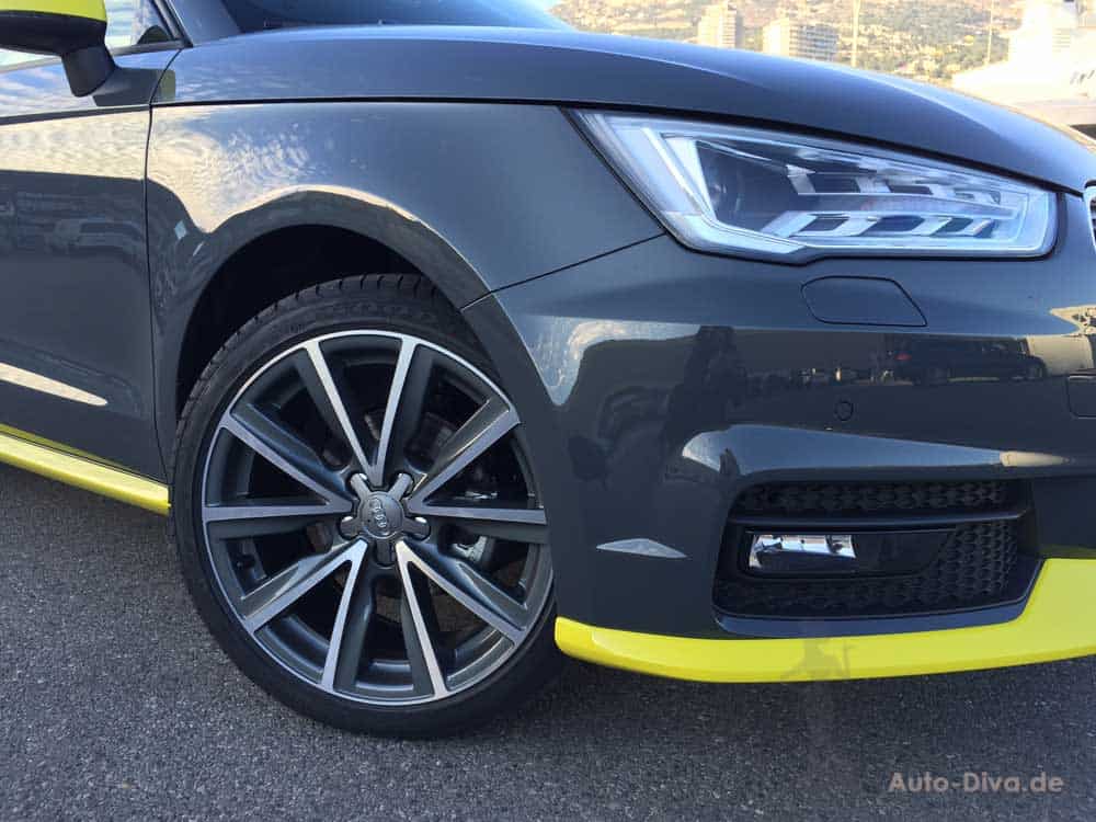 Individualisierung ist möglich: angefangen von farbigen Luftausstro?mern bis hin zu Dekorfolien fu?r die Karosserie. Das active kit beinhaltet auch außergewöhnliche Anbauteile und Ra?der-Designs. Man muss es nicht ganz so bunt treiben wie bei diesem Sondermodell, aber Spaß macht es schon, sich eine besondere Auswahl zusammen stellen zu können, die den Audi A1 unverwechselbar macht. Doch Vorsicht: kombiniere nie grün und blau (Außenfarbe / Innenfarbe). Ein Testwagen, der sich für die Rückfahrt anbot, war so ausgestattet. Im Zweifel lieber bei der Farbwahl Ton in Ton bleiben oder stark kontrastierende Töne kombinieren. Oder jemanden fragen, der geschmacks- und designsicher ist. Ich habe schon mit dem einen oder anderen Tipp einen Neuwagenkäufer vor Design-Katastrophen bewahrt. So jemanden wie mich gibt es sicherlich immer irgendwo in der Nähe, das ist sehr hilfreich, wenn man auf Nummer Sicher gehen will.